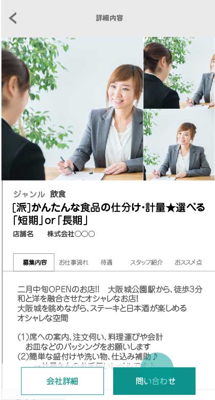 「土日休みですか?」「交通費は一部支給と記載がありますが、いくら出るのですか?」など求職者はチャットで気になる事を気軽に確認でき、不安要素を解消できる。 日本初のチャット予約ボタンで面接日時を決めリマインドプッシュ通知でドタキャンを防止できます。